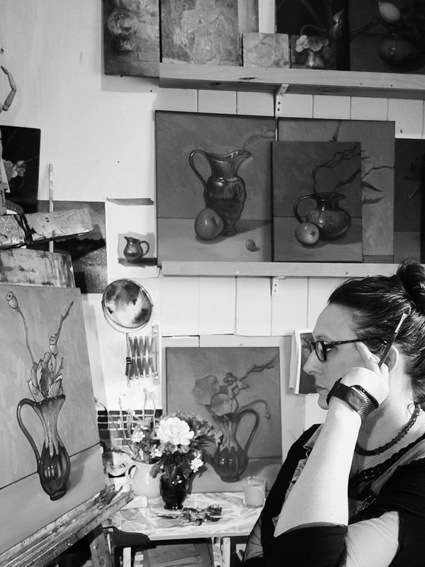 Jonette picked up the brush again while her children were still young, often painting till the early hours to allow her precious time in the studio. Around this time she began painting still life, a style that would go on to become her primary focus for over a decade. Painting in the style of traditional realism, her well crafted still life paintings explored the fleeting beauty of life, endurance, and living in the moment. Themes that are ever present for Jonette who lives with progressive and crippling disabilities.